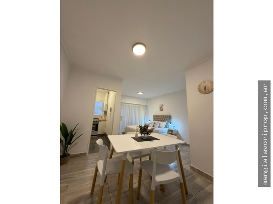 Dólares AmericanosEncantador departamento 1 ambiente desplazado ubicado al contrafrente luminoso. Cocina separada con ventilación natural. Baño completo con ventilación natural. Calefacción TB. Amoblado y decorado